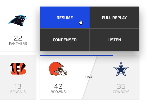 Relive the game exactly like you'd watch on Sunday with the broadcast view. Want more than just the highlights, but don't have time for the full broadcast? Watch a Condensed Game in ~45 minutes. Watch tape like the pros with Coaches Film, which shows all 22 players in one view.